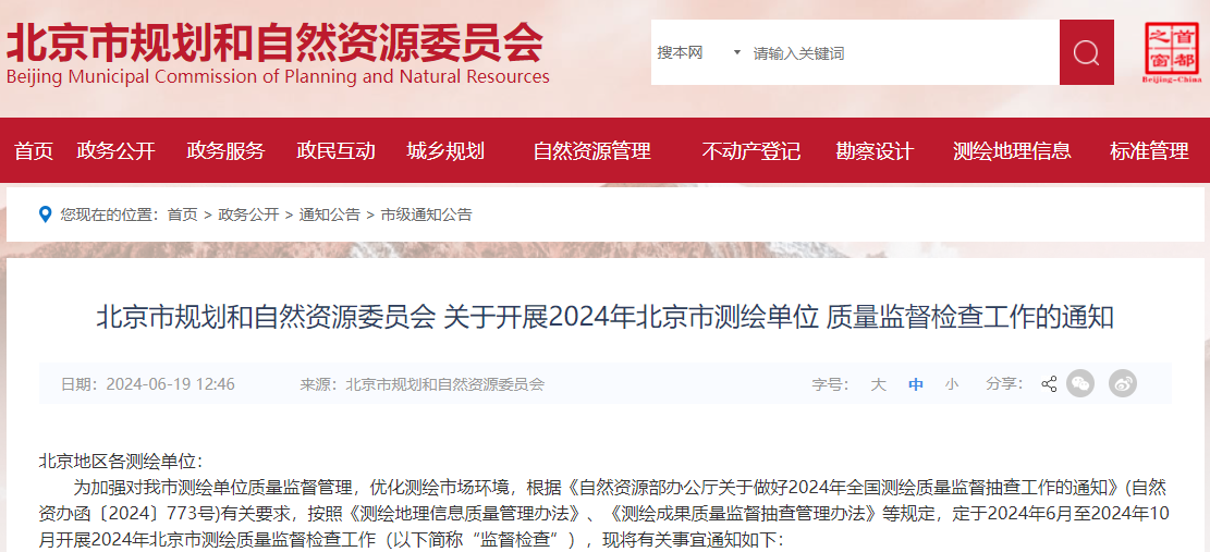 北京市规划和自然资源委员会 关于开展2024年北京市测绘单位 质量监督检查工作的通知
