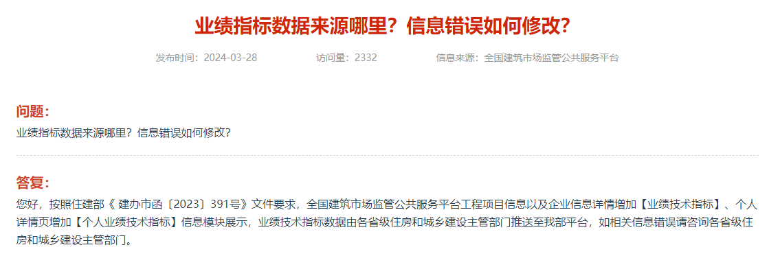 您好,按照住建部《 建办市函〔2023〕391号》文件要求,全国建筑市场监管公共服务平台工程项目信息以及企业信息详情增加【业绩技术指标】、个人详情页增加【个人业绩技术指标】信息模块展示,业绩技术指标数据由各省级住房和城乡建设主管部门推送至我部平台,如相关信息错误请咨询各省级住房和城乡建设主管部门。