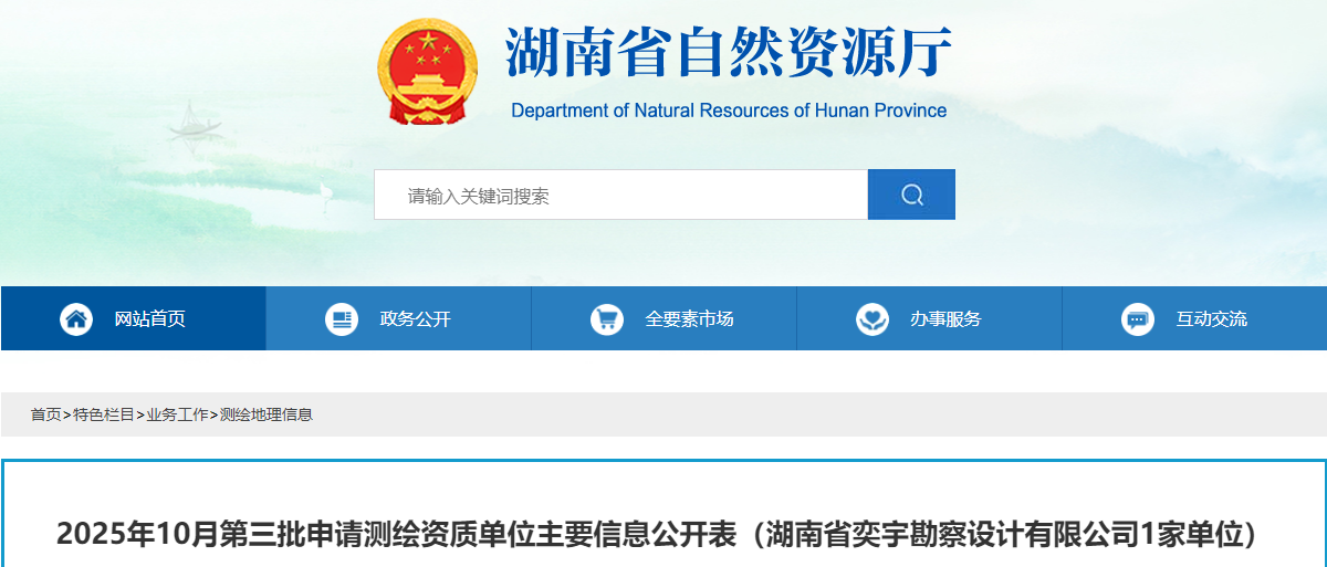 2025年10月第三批申请测绘资质单位主要信息公开表(湖南省奕宇勘察设计有限公司1家单位)