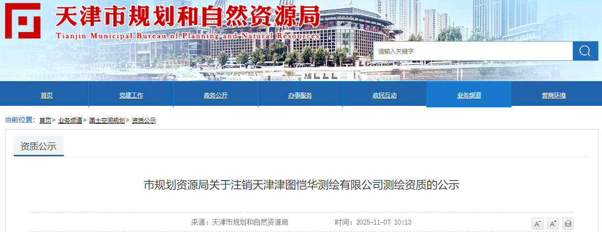 市规划资源局关于注销天津津图恺华测绘有限公司测绘资质的公示