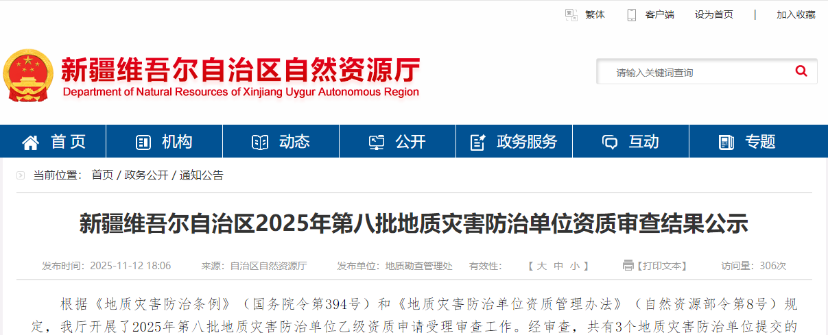 根据《地质灾害防治条例》(国务院令第394号)和《地质灾害防治单位资质管理办法》(自然资源部令第8号)规定,我厅开展了2025年第八批地质灾害防治单位乙级资质申请受理审查工作。经审查,共有3个地质灾害防治单位提交的4个资质申请予以通过,现予公示,公示期为自本公示发布之日起5个工作日。如对公示内容有异议,请在公示期内以书面形式向新疆维吾尔自治区自然资源厅反映,并写明提出异议的事实依据、个人真实姓名、工作单位、地址、邮编和联系方式等。