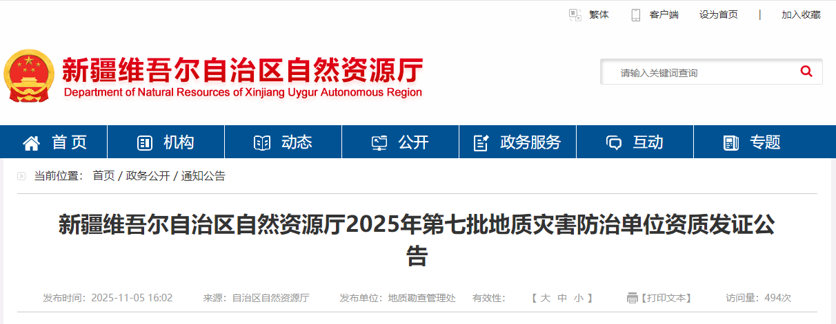 新疆维吾尔自治区自然资源厅2025年第七批地质灾害防治单位资质发证公告