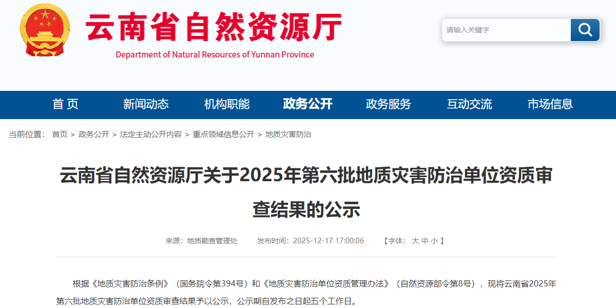 云南省自然资源厅关于2025年第六批地质灾害防治单位资质审查结果的公示