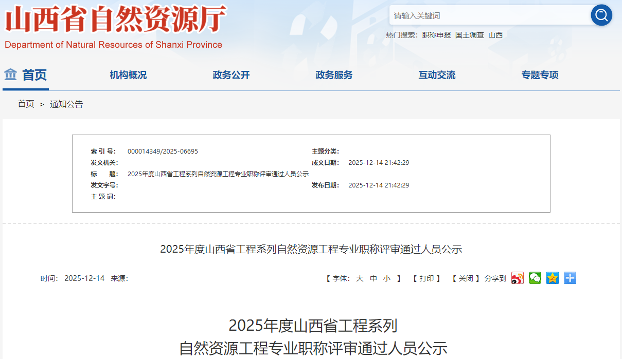 按照省人力资源和社会保障厅《关于做好2025年度全省职称评审工作的通知》要求,现将山西省工程系列自然资源工程专业高级工程师评审委员会2025年12月14日评审通过的高级工程师、工程师、助理工程师、技术员名单予以公示。
