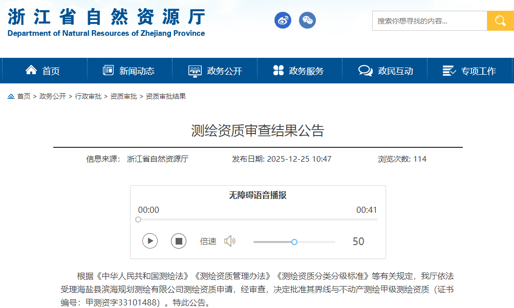 根据《中华人民共和国测绘法》《测绘资质管理办法》《测绘资质分类分级标准》等有关规定,我厅依法受理海盐县滨海规划测绘有限公司测绘资质申请,经审查,决定批准其界线与不动产测绘甲级测绘资质(证书编号:甲测资字33101488)。特此公告。
